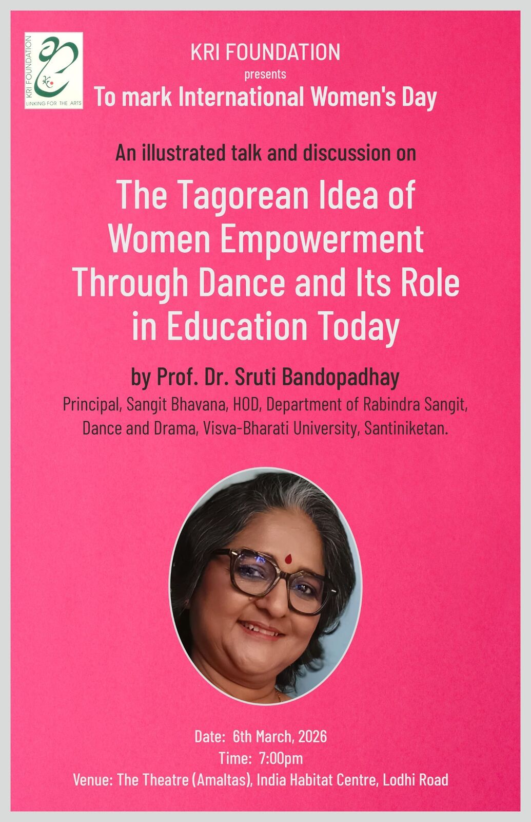 In Dr. Sruti Bandopadhay we have a dancer scholar who has deep knowledge of Tagorean thought and artistry. Don't miss this multi-layered presentation by her and share your own ideas about education and art in making our identity and our present standing. Join us at 7 pm, on 6th March at India Habitat Centre.